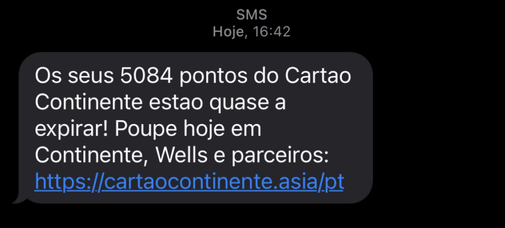 O esquema funciona através de uma mensagem de telemóvel a informar que os pontos do Cartão Continente estão prestes a caducar. Para tornar tudo mais credível, a SMS contém um link que parece oficial, mas que conduz a uma página fraudulenta.