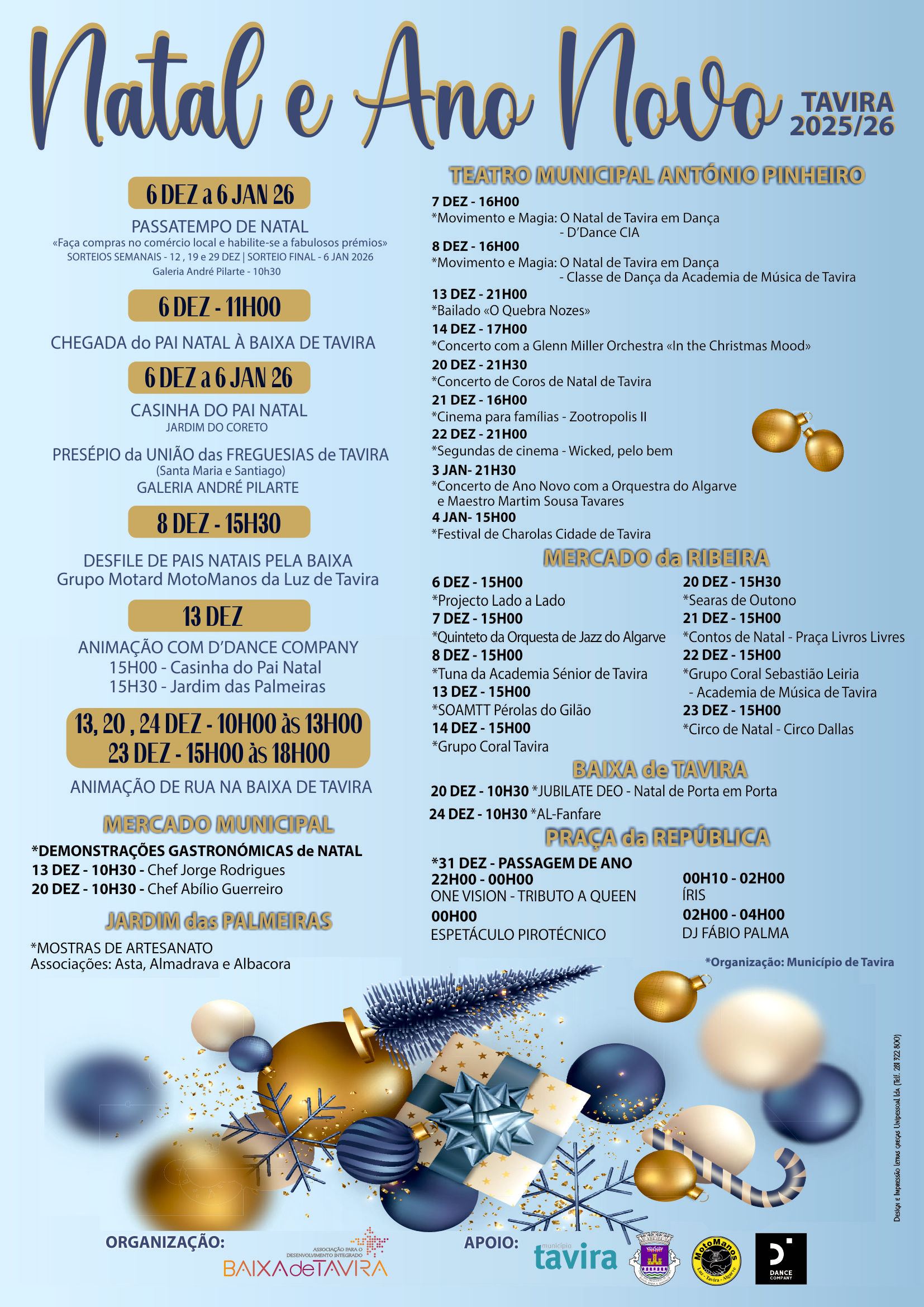A Associação Baixa Tavira, com o apoio do Município de Tavira, vai dinamizar um conjunto de iniciativas destinadas a promover a economia local ao longo da quadra natalícia. As atividades arrancam no sábado, 6 de dezembro, às 11:00, com a chegada do Pai Natal à zona baixa da cidade, prometendo “trazer consigo companhia e muitas surpresas”.