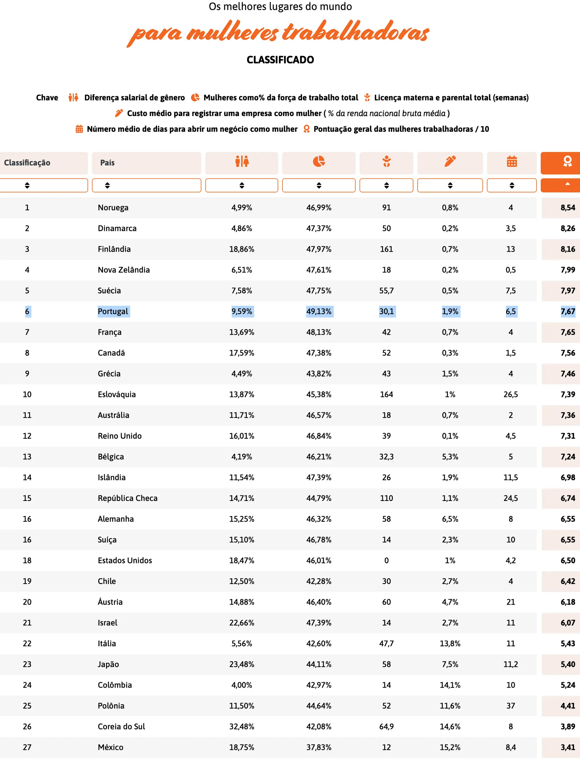 A análise feita pela SmartSurvey tem em conta a diferença salarial entre homens e mulheres, o peso das mulheres na força de trabalho, a duração das licenças parentais, e o custo para uma mulher abrir e registar um negócio.