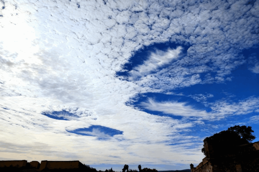 Este domingo ficou marcado por um fenómeno meteorológico pouco habitual em Portugal, observado em três pontos do Alentejo. Moradores de Elvas, Marvão e Monforte registaram formações de nuvens com grandes “buracos”, conhecidas como nuvens perfuradas ou fallstreak holes, que despertaram curiosidade e surpresa entre quem assistiu ao fenómeno.