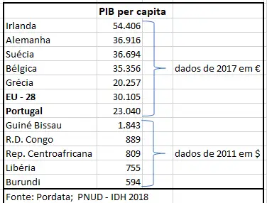 Na tabela abaixo, podemos ver que Portugal e a Grécia têm um PIB pc muito inferior à média da UE, apesar de tudo, a Grécia com um PIB pc inferior a Portugal tem um salário mínimo de 683 €. A Irlanda teve um resgate ao mesmo tempo que Portugal e a Grécia, mas tem um PIB pc que é mais do dobro, pelo que tem salários mais altos e um nível de vida que não se compara. A diferença é resultante da produtividade motivada pelo apoio ao pequeno investimento, esse apoio não envolve dar subsídios, mas tão somente não torpedear, quem quer ter iniciativa, com múltiplas licenças que chegam a levar anos para serem concedidas e cobrança de taxas e impostos mesmo antes do início de actividade.