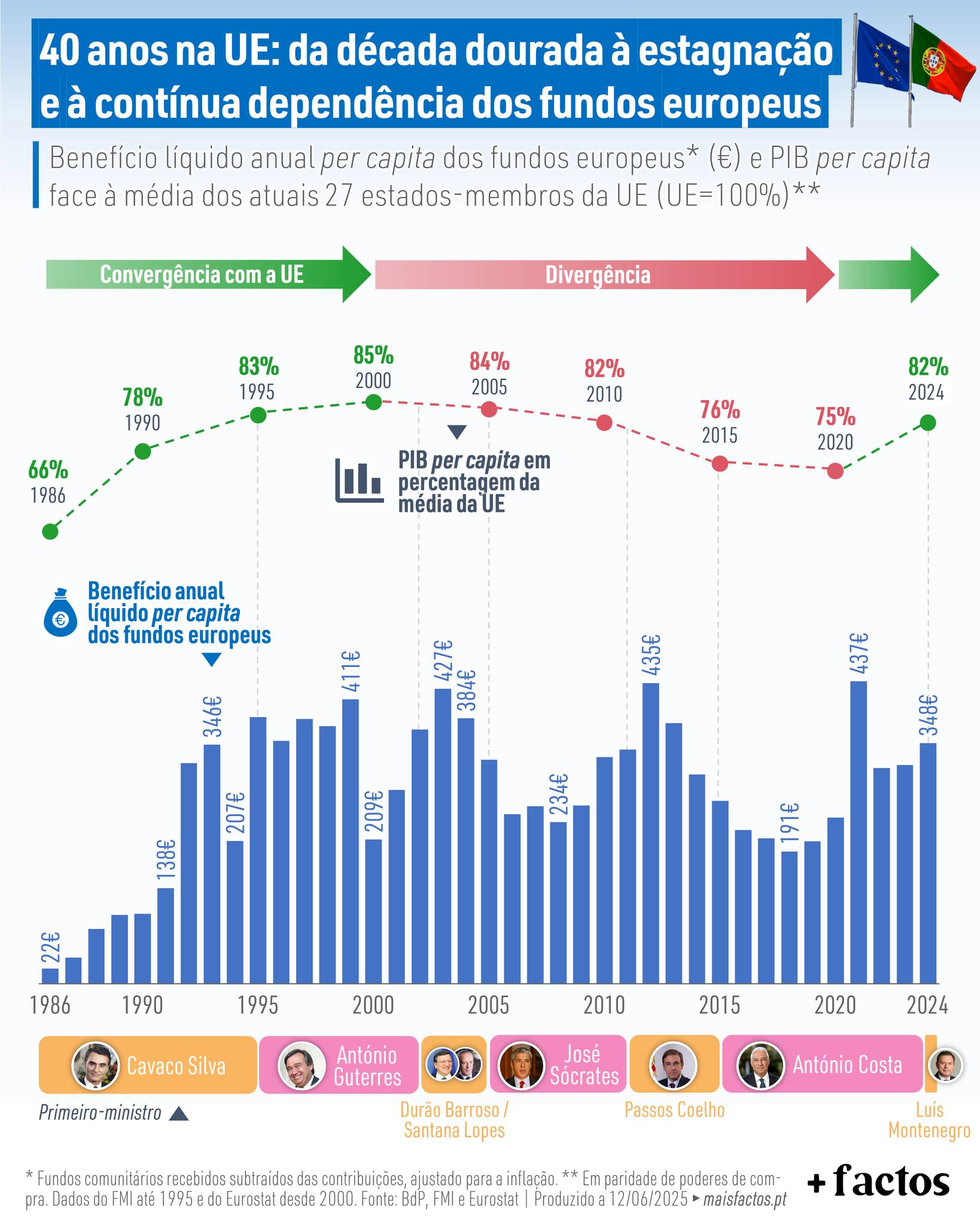 Uma das justificações que mais se ouve para esta evolução, ainda nos dias de hoje, é que Portugal recebeu valores exorbitantes de fundos europeus. É verdade que Portugal beneficiou em larga escala dos fundos europeus (benefício líquido anual per capita), sobretudo a partir de 1992, mas, continuou a receber valores semelhantes, ou até superiores, desde então, mas a economia deixou de convergir com a média na UE. Aliás, este século tem sido essencialmente marcado por uma divergência, apesar de ter havido uma ligeira convergência desde 2020. Em 2024 o PIB per capita português fixava-se em 82% da média da UE, ainda abaixo do que se verificava em 2000.