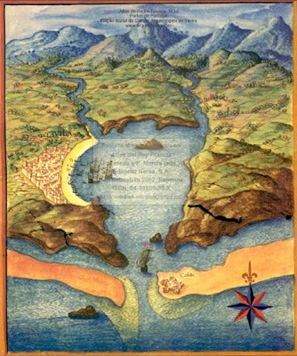 A representação de Pedro Teixeira no séc. XVII revela um largo estuário com uma apertada barra com apenas “8 palmos de baixamar, e de preamar 2 braças pouco mais ou menos”. De notar a localização do chamado forte do Rato na ilha barreira, que mais tarde abre a levante ficando o forte numa ilha chamada ilha das lebres.