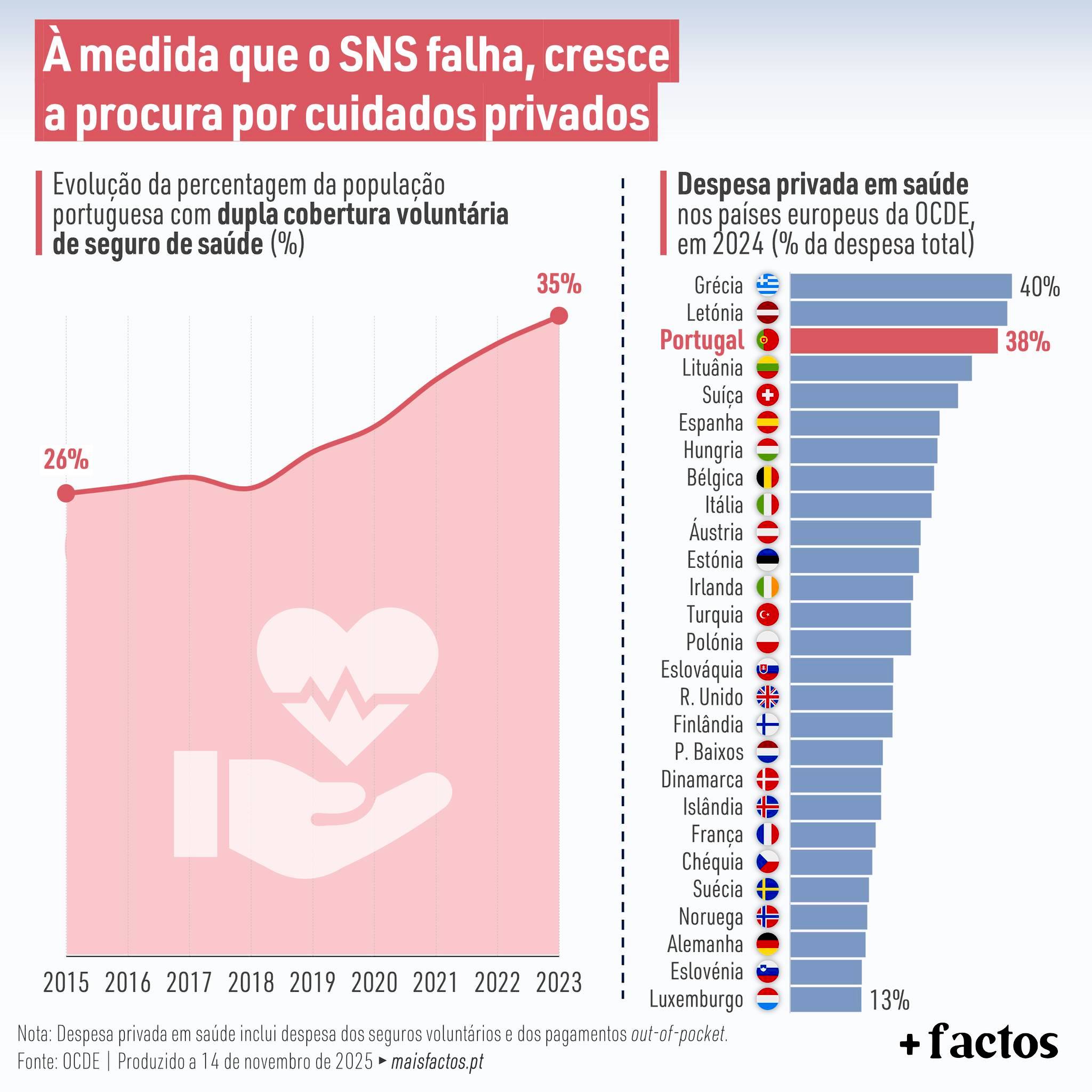 Não surpreende, por isso, que Portugal seja hoje o 3.º país da OCDE na Europa onde a despesa privada em saúde representa maior peso na despesa total (38%), através de seguros voluntários ou pagamentos diretos.