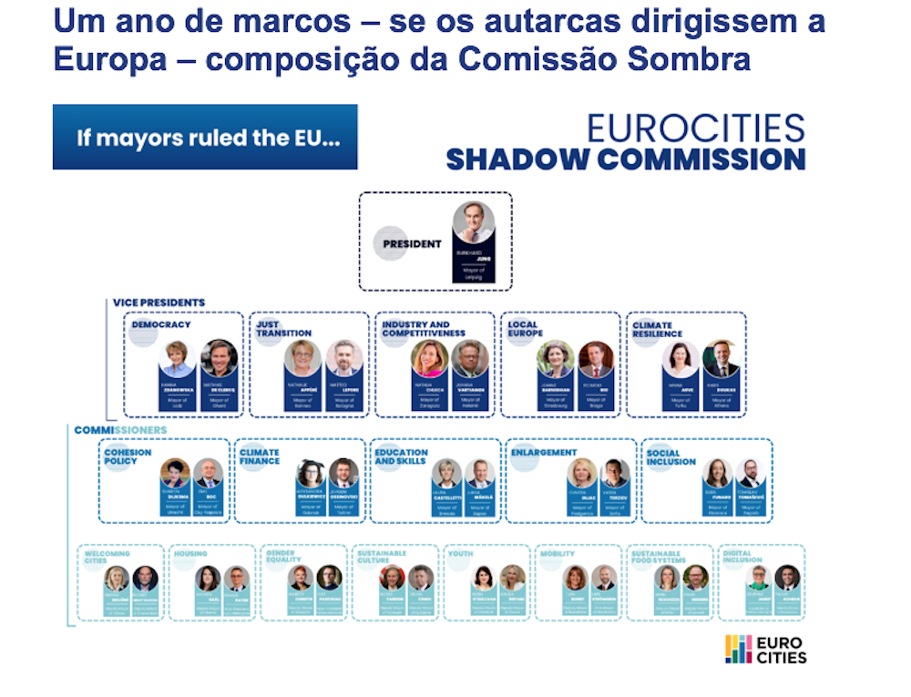 O que começou há apenas um ano como um apelo a uma representação urbana mais forte na UE tornou-se rapidamente uma força visível na política europeia: a Comissão Sombra Eurocities. Concebido para refletir o Colégio de Comissários da Comissão Europeia, refletindo simultaneamente as realidades e ambições das cidades europeias, tornou-se uma plataforma em que os autarcas atuam como homólogos políticos diretos dos líderes da UE. Hoje, a Comissão Sombra Eurocities é simultaneamente um símbolo e um instrumento para garantir que as vozes dos 75 % dos europeus que vivem nas cidades são ouvidas em Bruxelas e Estrasburgo.