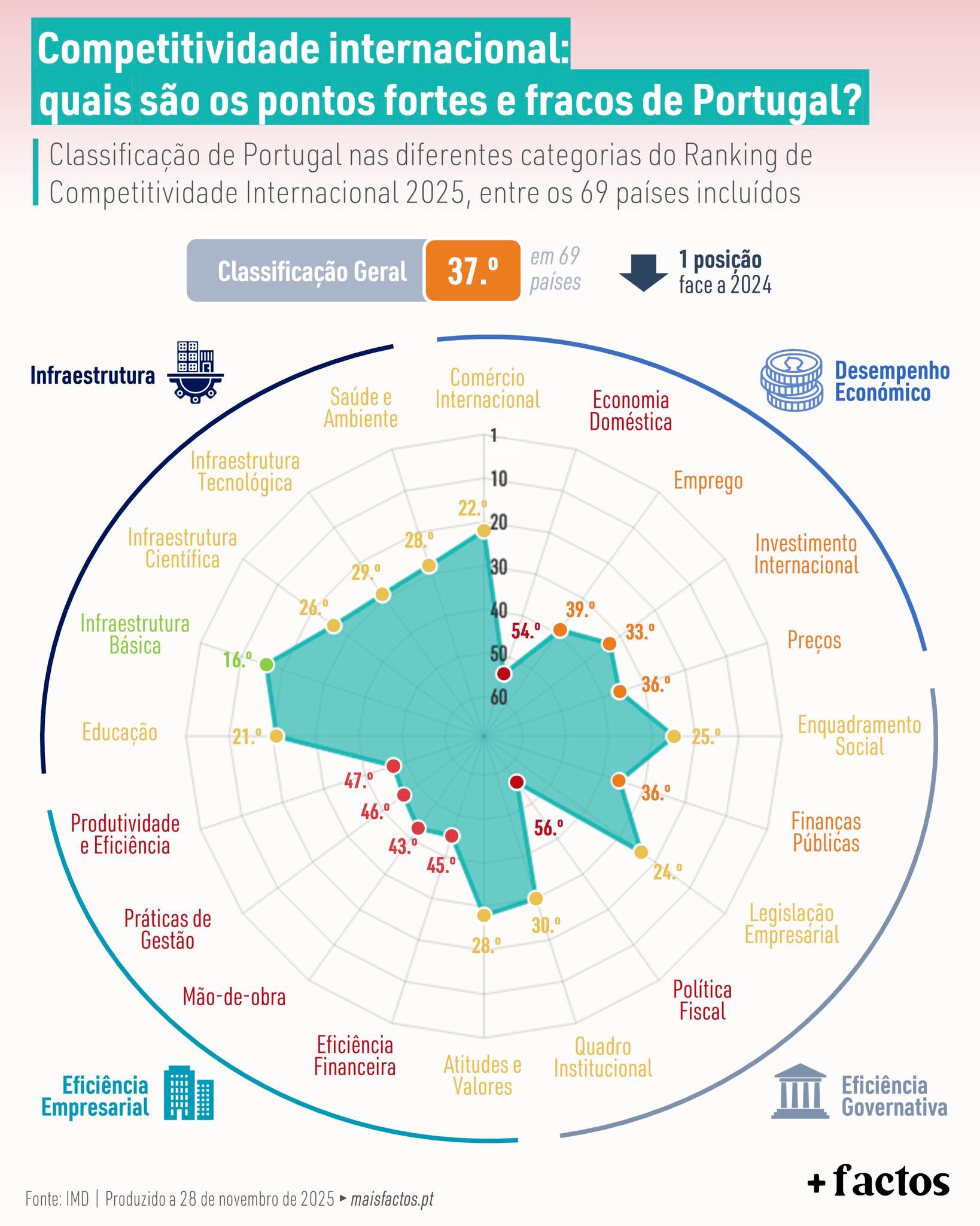 Ter boas infraestruturas, uma população relativamente qualificada e abertura ao comércio internacional já não chega para garantir prosperidade. O mais recente “Ranking de Competitividade Internacional 2025”, do IMD, na Suíça, mostra bem esse paradoxo: Portugal mantém-se na metade inferior da tabela, ocupando o 37.º lugar entre 69 países — uma ligeira descida (uma posição) face ao ano anterior. Não se trata de uma queda abrupta, mas de mais um sinal de estagnação num contexto global cada vez mais competitivo.