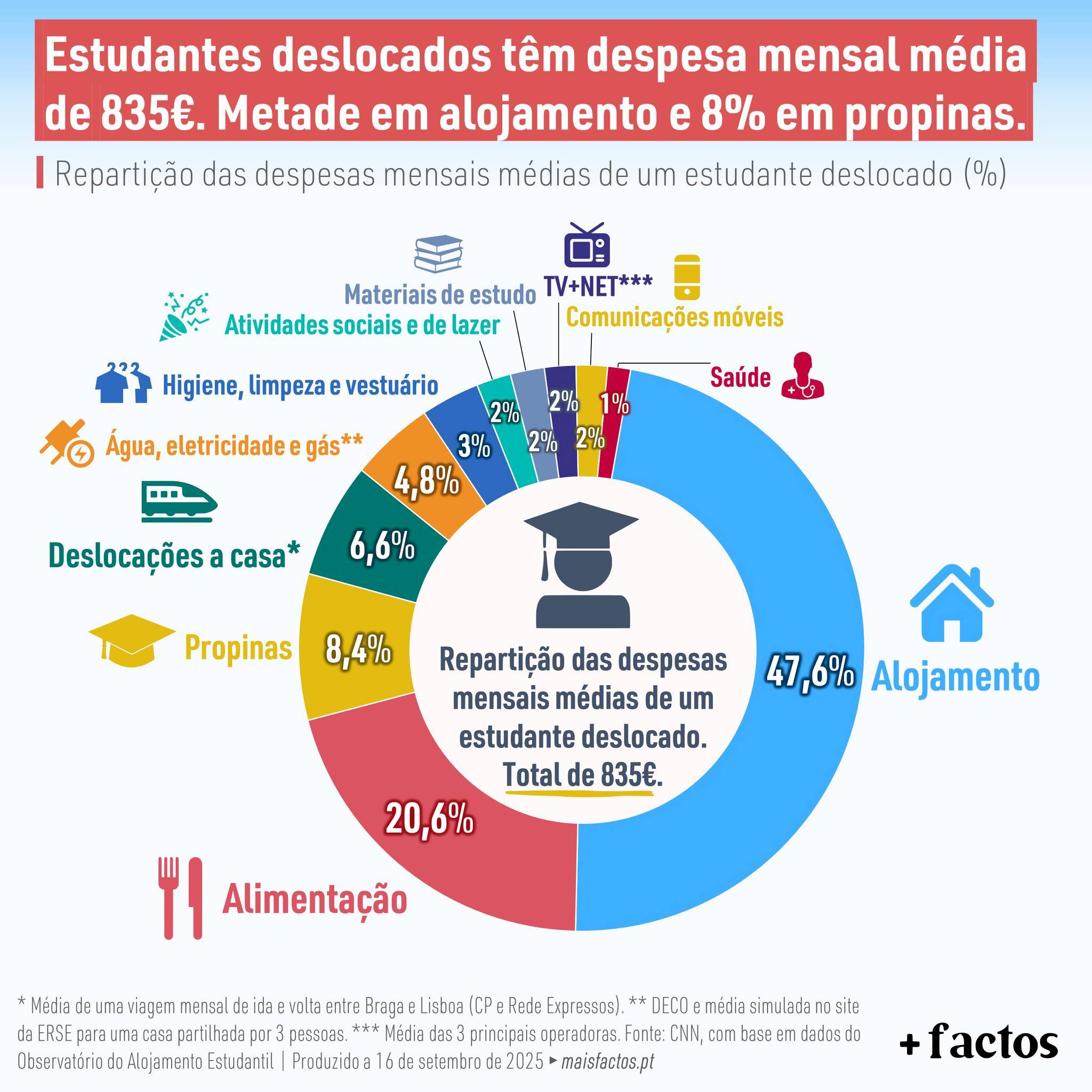 Ou seja, 92% das despesas mensais têm outras origens. O alojamento (47,6%) e a alimentação (20,6%) dominam o orçamento e, em conjunto, representam mais de dois terços dos custos totais. Esta realidade torna evidente que o problema central não são as propinas, mas sim o custo de vida — especialmente nas grandes cidades universitárias, onde o alojamento é escasso e cada vez mais inacessível para muitos jovens.