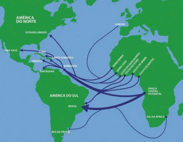 ► Estima-se que o comércio esclavagista transatlântico a partir das rotas da Guiné, Mina, Angola e Moçambique, tenha envolvido entre 12 a 14 milhões de pessoas das quais, pouco menos de metade, com destino ao Brasil