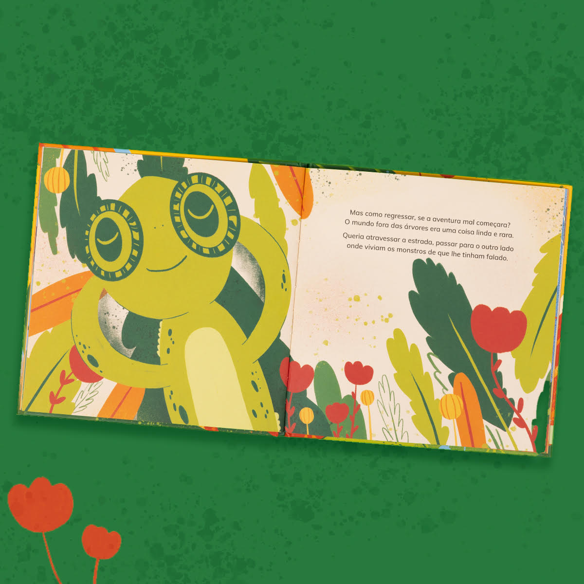 «O Napoleão é um camaleão muito curioso. E teimoso! A mãe pediu-lhe que não saísse das árvores, porque no chão há monstros e muitos outros perigos. Mas Napoleão não lhe deu ouvidos. E agora? O que irá acontecer?»