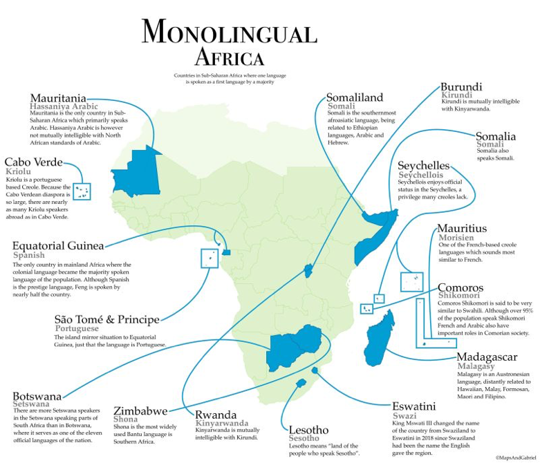 Países como a Somália onde o somali é a língua principal, ou as Ilhas Maurício, com o crioulo morisien, demonstram como uma única língua pode ser uma poderosa ferramenta de construção de nação, promovendo uma identidade compartilhada e reduzindo divisões internas. Similarmente, em Botsuana e no Lesoto, o setsuana e o sesoto não são apenas línguas majoritárias, mas também atuam como pontes que unem comunidades para além das fronteiras políticas, fortalecendo a soberania.