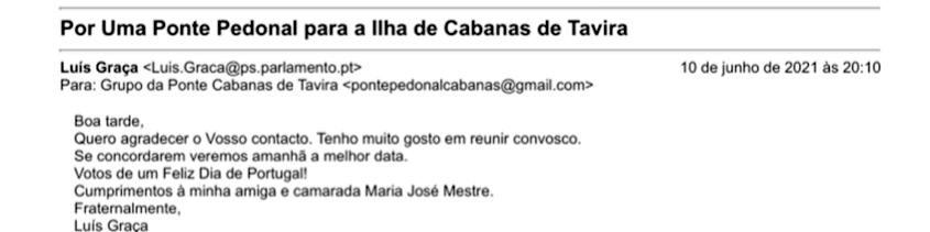 Nestes seis anos de luta pela ponte, temos procurado ser ouvidos pelos responsáveis políticos e pelas entidades que tutelam a Ria Formosa. De alguns, o melhor que podemos dizer, é que continuamos à espera de ser ouvidos, mas acreditamos nos políticos e nas instituições que nos representam, porque acreditamos convictamente na democracia.