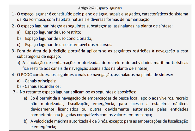 Importa perceber que o artigo 26º e relativamente à circulação de embarcações motorizadas de recreio e de actividades marítimo-turísticas especifica que fica restrita aos canais de navegação assinalados na planta de síntese;
