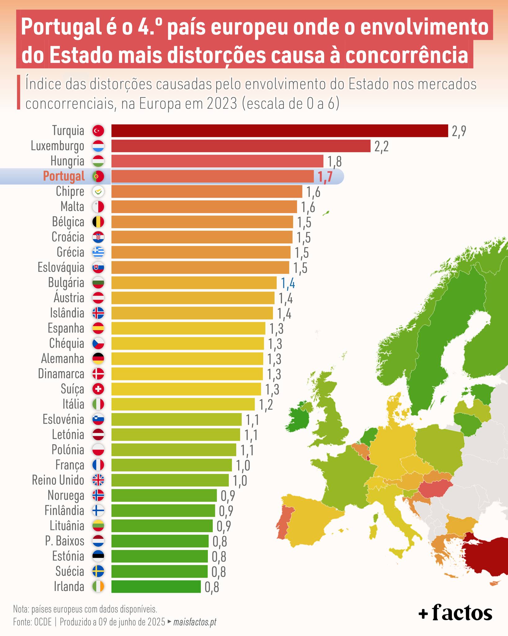 Por contraste, países como Irlanda, Suécia, Estónia e Países Baixos apresentam os níveis mais baixos de distorção, favorecendo um ambiente mais propício ao crescimento económico e à inovação empresarial.