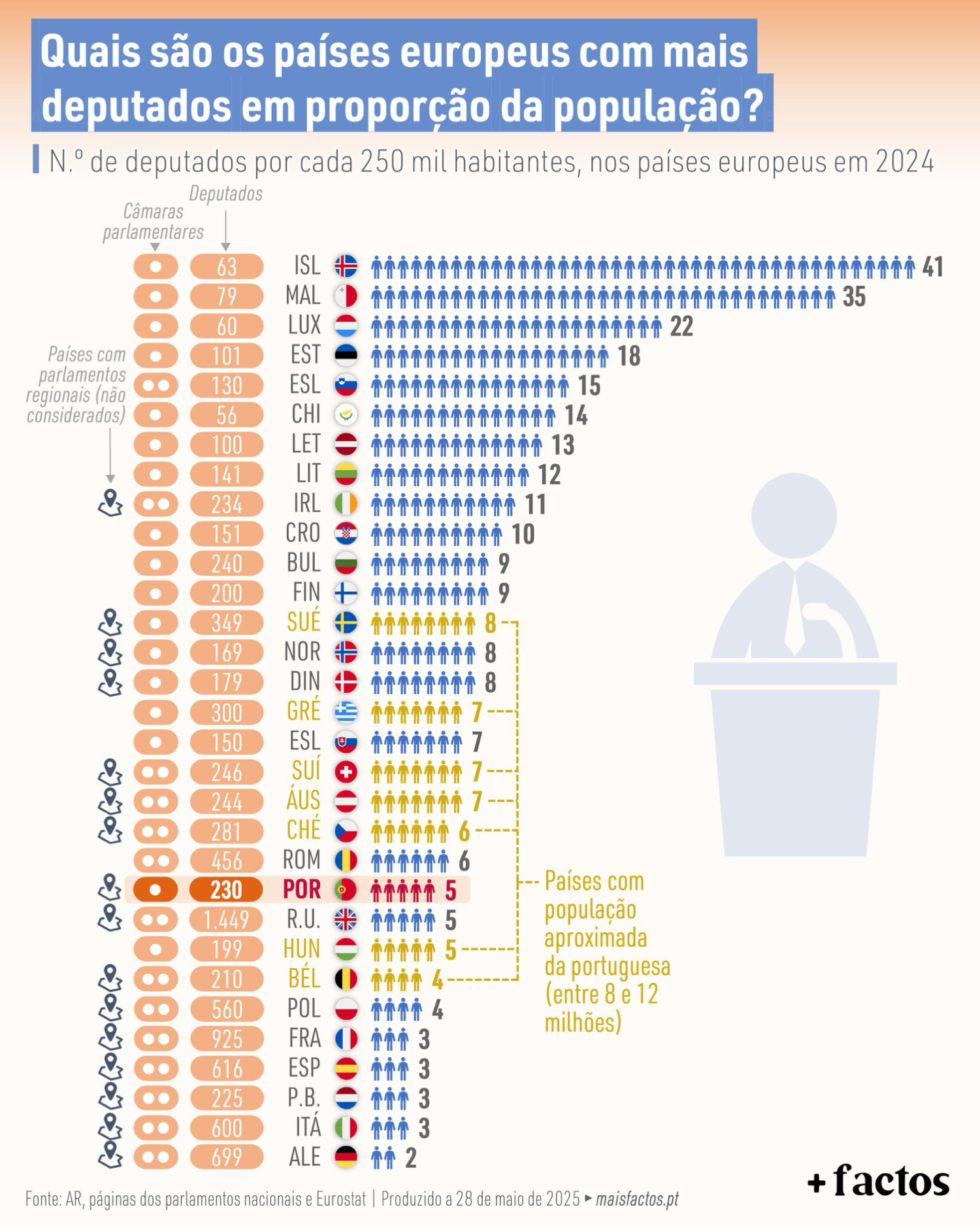 Comparando Portugal com países de dimensão similar (de 8 a 12 milhões de habitantes), constatamos também que há 4 países com mais deputados – Suécia, Grécia, Suíça, Áustria e Chéquia – e apenas 2 com menos deputados – Hungria e Bélgica.