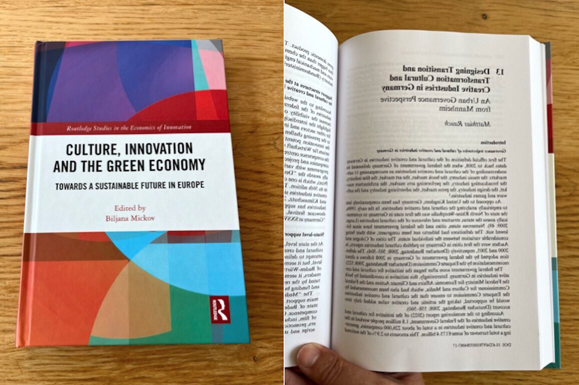 Tive a sorte de ter sido convidado pelo maravilhoso editor Dra. Biljana Mickov para contribuir para este impressionante Routledge Livros volume sobre “Cultura, Inovação e Economia Verde. Rumo a um futuro sustentável na Europa”, partilhando alguns dos conhecimentos e aprendizagens sobre o apoio e a governação das indústrias culturais e criativas na Alemanha, em geral, e na cidade de Mannheim, em particular.