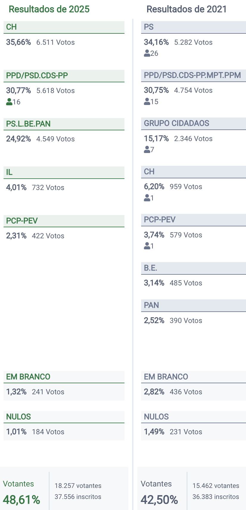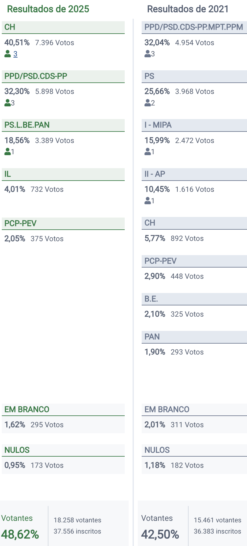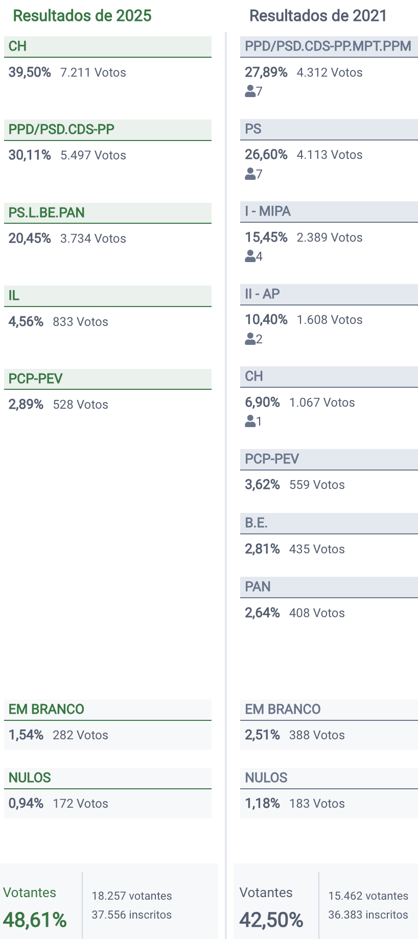Depois do Chega, com 40,51%, o segundo mais votado é o PPD/PSD.CDS-PP, com 32,30%, e o terceiro é o PS.L.BE.PAN, com 18,56% dos votos.