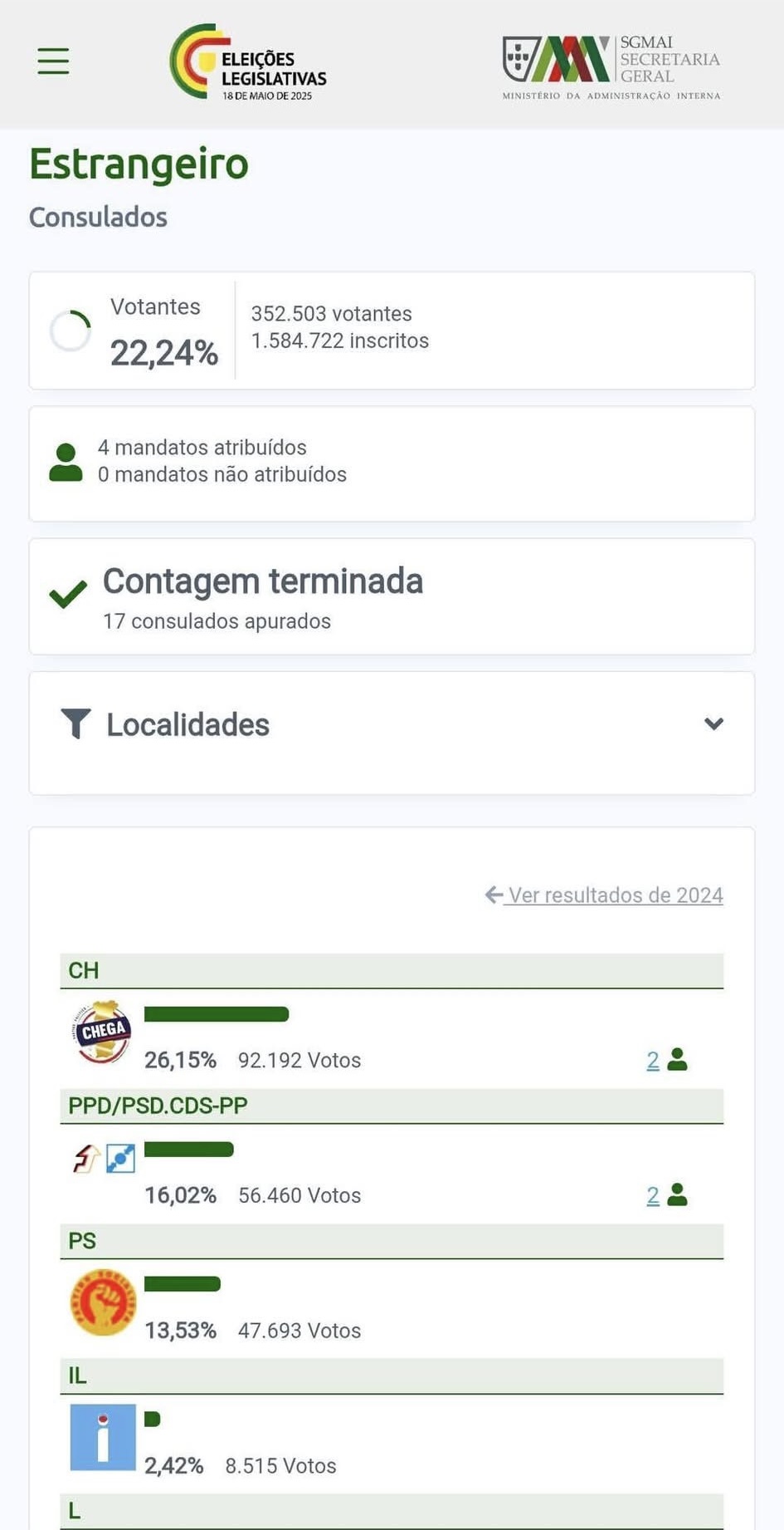Com o apuramento destes círculos, a AD venceu as eleições legislativas de 18 de maio, com 91 deputados, o Chega alcança 60 deputados e o PS elege 58.