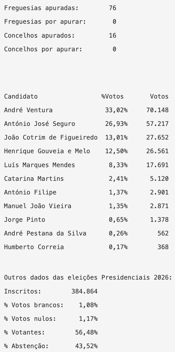 De acordo com os dados provisórios da Secretaria-Geral do Ministério da Administração Interna – Administração Eleitoral, o candidato independente recebeu 71 votos dos 20.710 votantes, ficando em 10.º lugar entre os 11 candidatos.