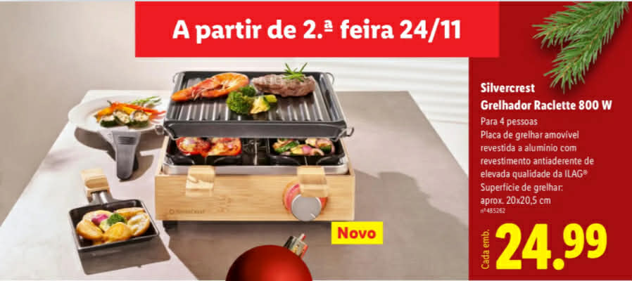 A cadeia Lidl volta a apostar em pequenos eletrodomésticos para a cozinha e prepara a chegada de um novo grelhador raclette da marca própria Silvercrest, pensado para quem gosta de jantares descontraídos em torno da mesa. Segundo o folheto divulgado pela insígnia, o aparelho estará disponível a partir de segunda-feira, 24 de novembro, por 24,99 euros, preço que o coloca na faixa de entrada deste tipo de equipamento.