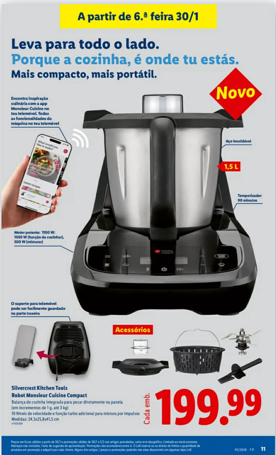 O folheto promocional do Lidl apresenta o equipamento com a mensagem “Leva para todo o lado. Porque a cozinha, é onde tu estás”, reforçando a ideia de mobilidade e arrumação mais simples. O Monsieur Cuisine Compact surge com um copo em aço inoxidável e capacidade de 1,5 litros, pensado para preparar receitas sem ocupar o espaço típico dos modelos maiores.