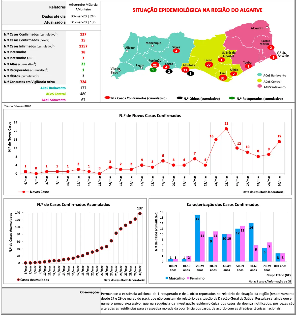O Algarve contabiliza, no total, 137 casos confirmados de Covid-19, segundo o boletim de hoje da Administração Regional de Saúde do Algarve.