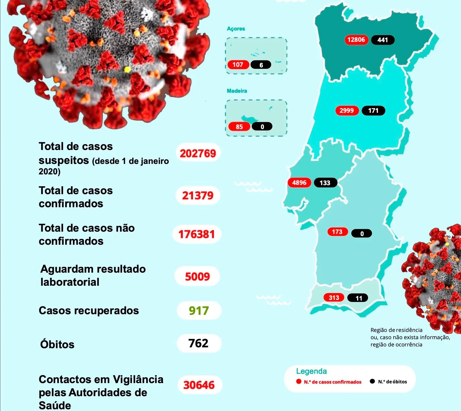 Portugal regista hoje 762 mortos associados à covid-19, mais 27 do que na segunda-feira, e 21.379 infetados (mais 516), indica o boletim epidemiológico divulgado hoje pela Direção-Geral da Saúde (DGS).