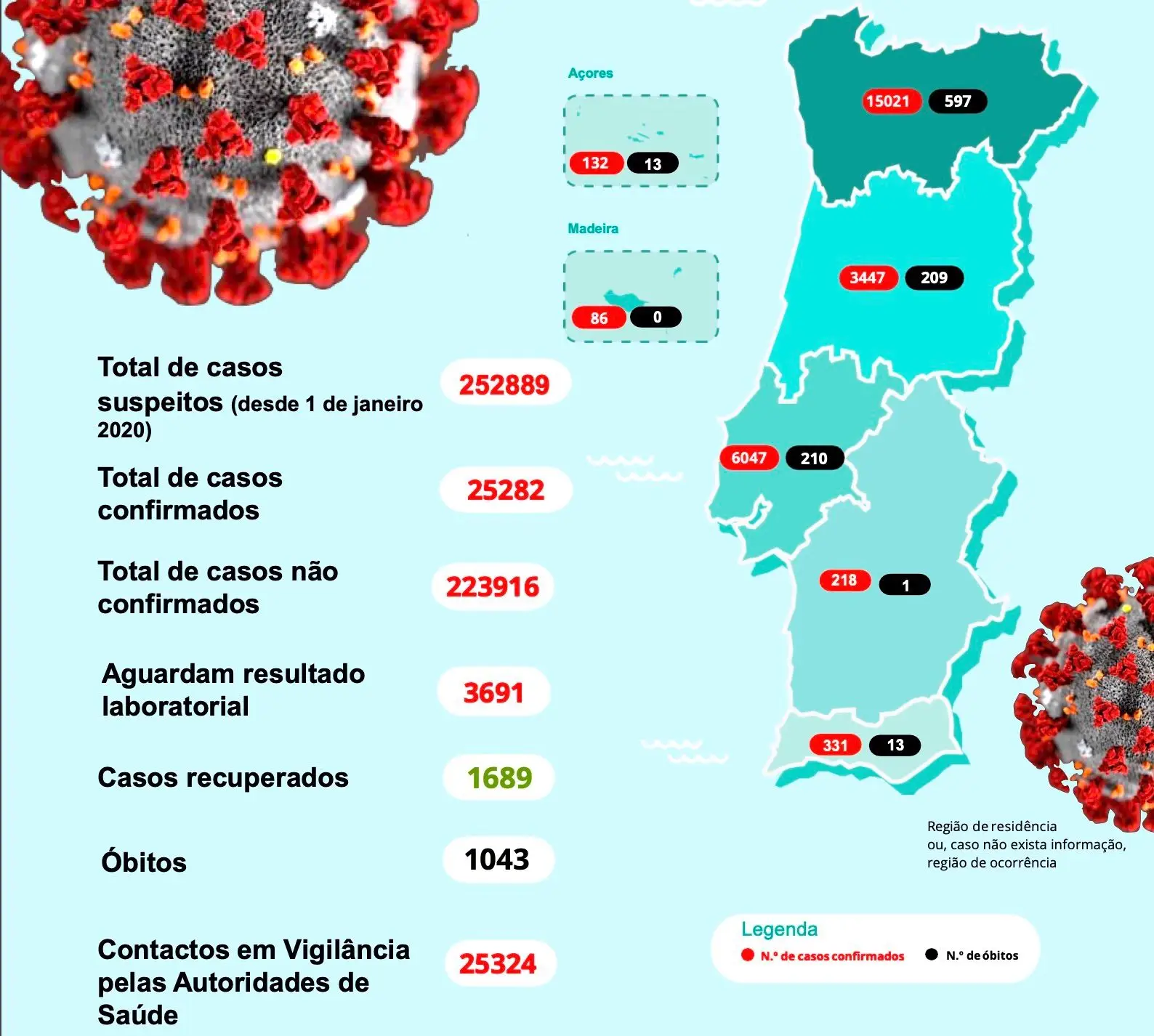 Portugal regista hoje 1.043 mortos relacionadas com a covid-19, mais 20 do que no que sábado, e 25.282 infetados (mais 92), segundo o boletim epidemiológico divulgado hoje pela Direção Geral da Saúde.