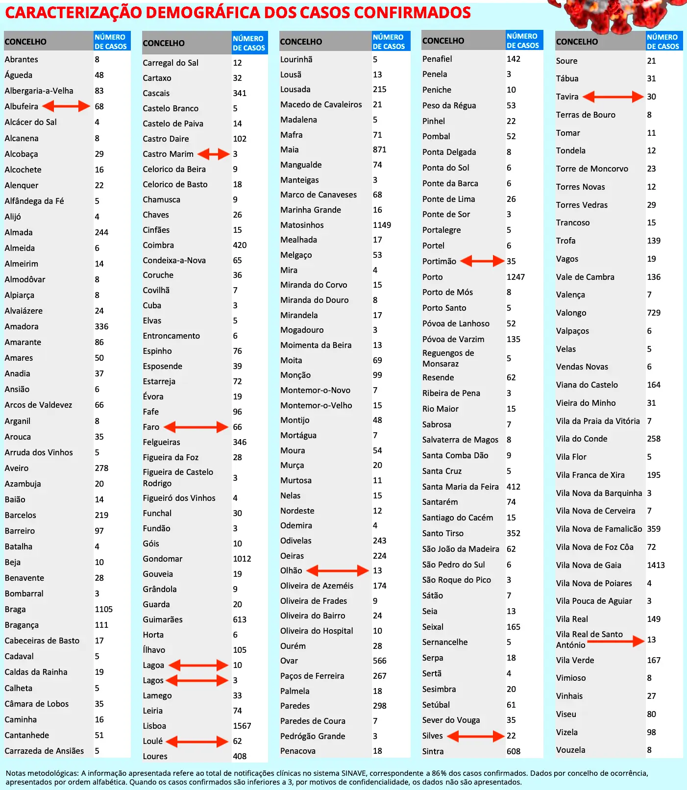 *Notas metodológicas da DGS: A informação apresentada refere ao total de notificações clínicas no sistema SINAVE, correspondente a 86% [+1% desde sexta-feira] dos casos confirmados". Os dados por concelho de ocorrência, apresentados por ordem alfabética. Quando os casos confirmados são inferiores a 3, por motivos de confidencialidade [?], os dados não são apresentados.