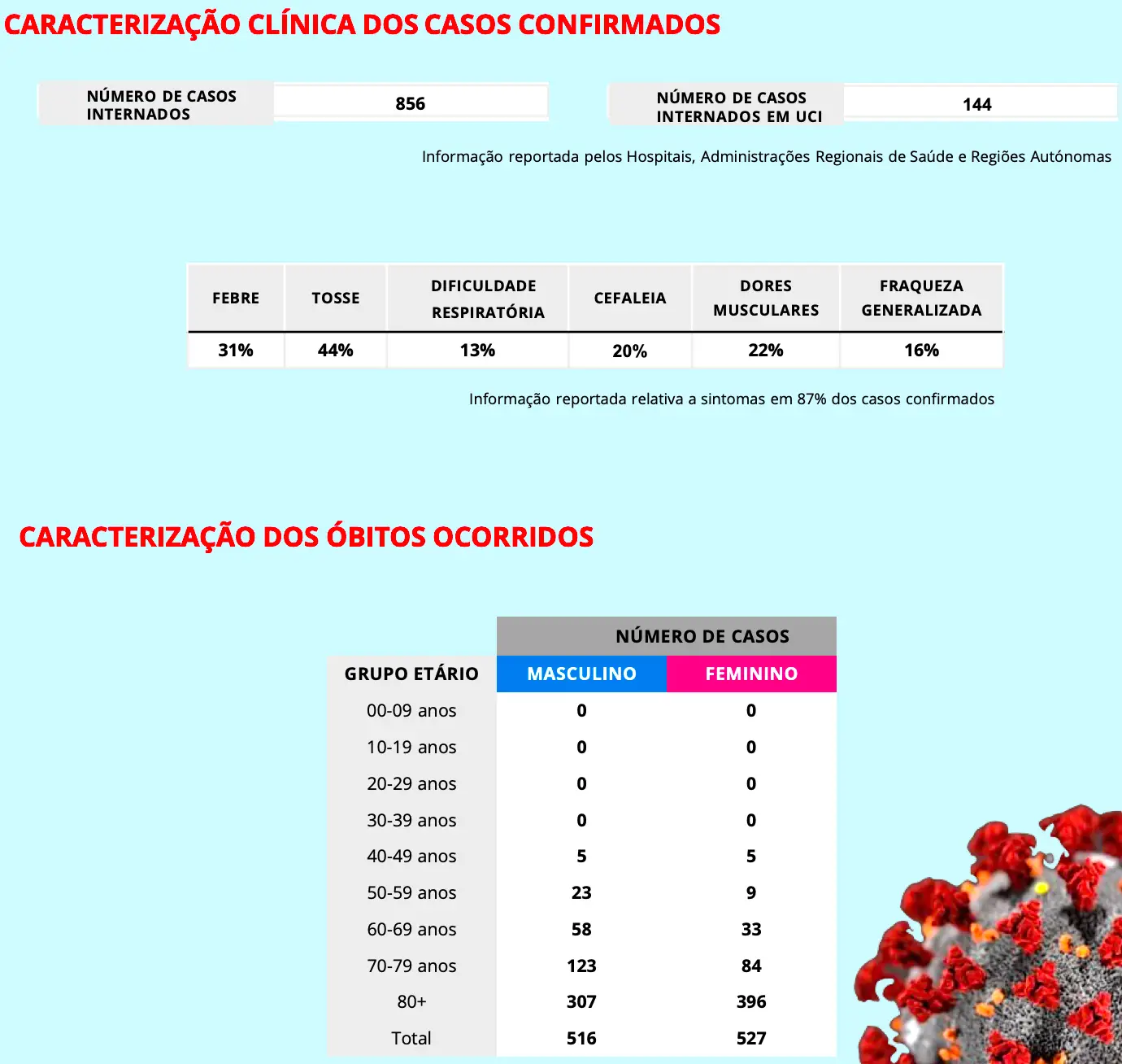 Quanto aos quadros referentes aos casos confirmados e óbitos pela DGS [aqui reproduzidos] têm hoje a seguinte descrição: