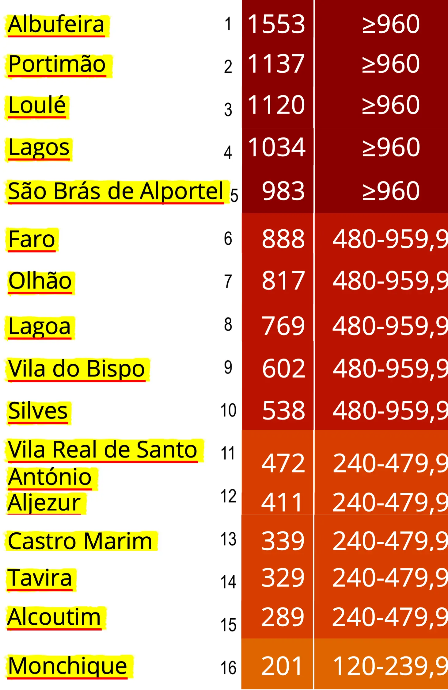 Acima deste limiar máximo, de acordo com as categorias definidas pelo Centro Europeu de Prevenção e Controlo de Doenças (ECDC), mantêm-se Albufeira (1.553 casos por 100 mil habitantes), Loulé (1.120) e, a partir de agora, Lagos (1.034), Pedrogão Grande (966), Portimão (1.137), São Brás de Alportel (983) e Sines (1.335).