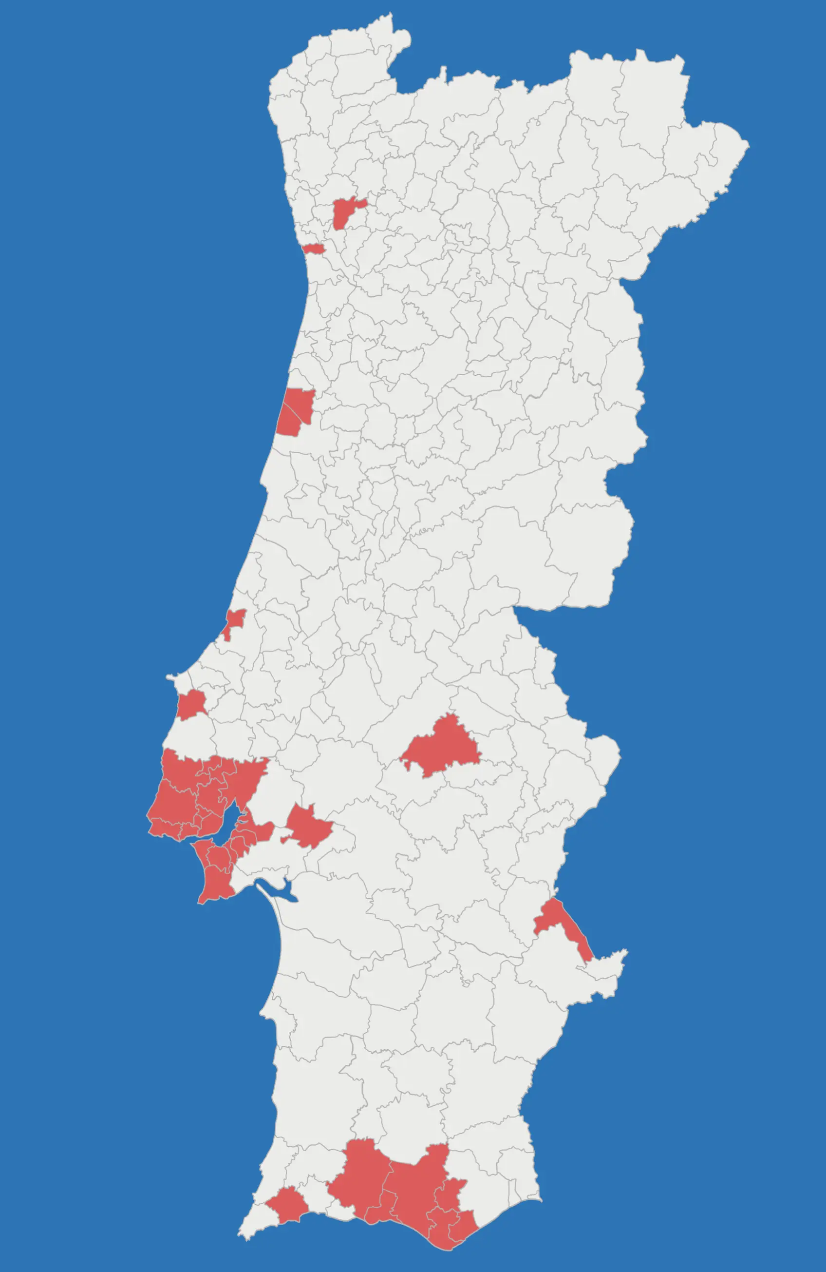 Albufeira, Alcochete, Almada, Amadora, Arruda dos Vinhos, Avis, Barreiro, Cascais, Faro, Lagos, Lisboa, Loulé, Loures, Lourinhã, Mafra, Mira, Moita, Montijo, Mourão, Nazaré, Odivelas, Oeiras, Olhão, Porto, Santo Tirso, São Brás de Alportel, Seixal, Sesimbra, Silves, Sintra, Sobral de Monte Agraço, Vagos e Vila Franca de Xira.