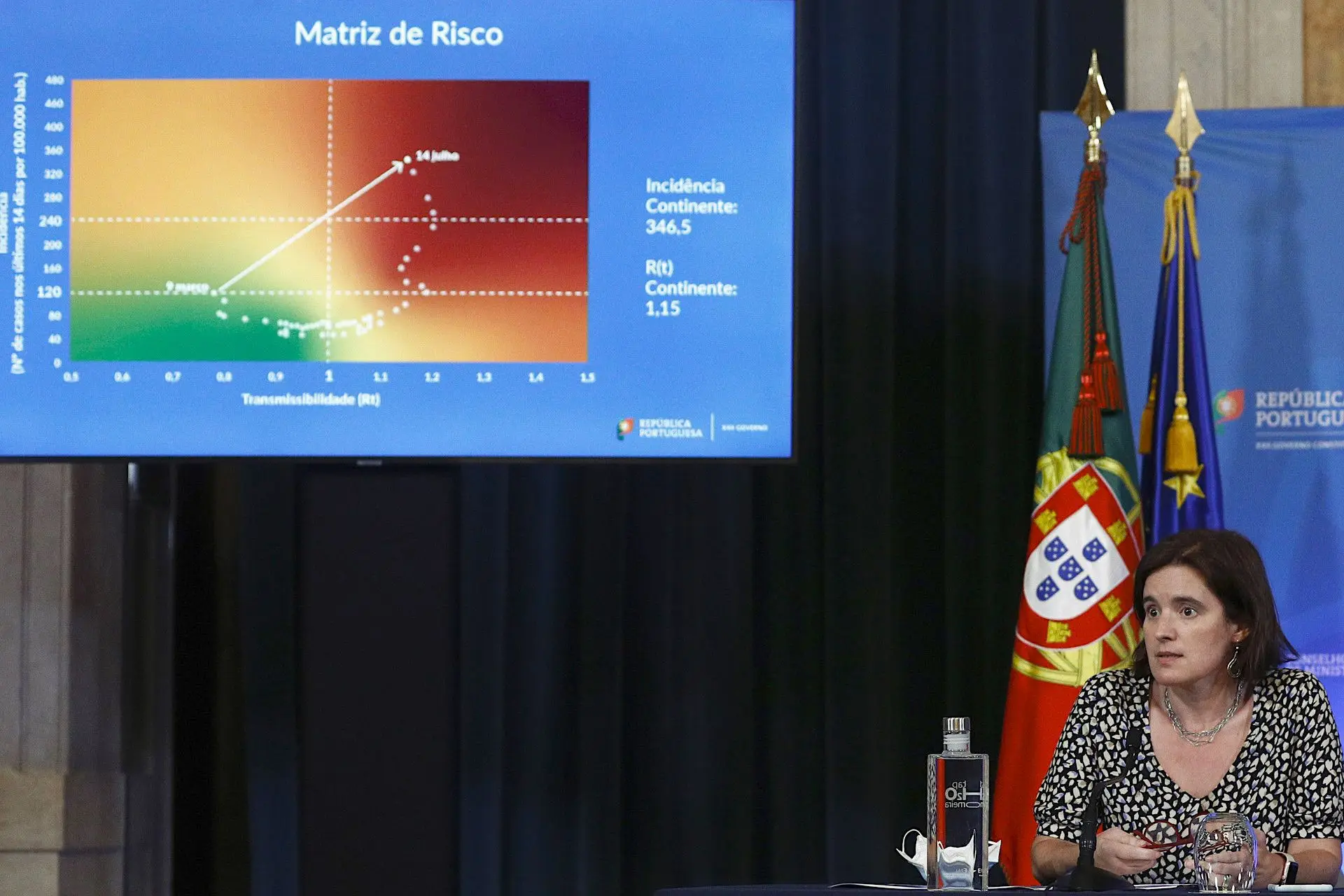 “Quando olhamos para a situação do nosso país na matriz de risco, vemos que a situação continua a degradar-se. Temos hoje no continente uma incidência [de novos casos de infeção] de 346,5 por 100 mil habitantes e um ritmo de transmissão (Rt) [do vírus] de 1,15”, adiantou Mariana Vieira da Silva, após o Conselho de Ministros.
