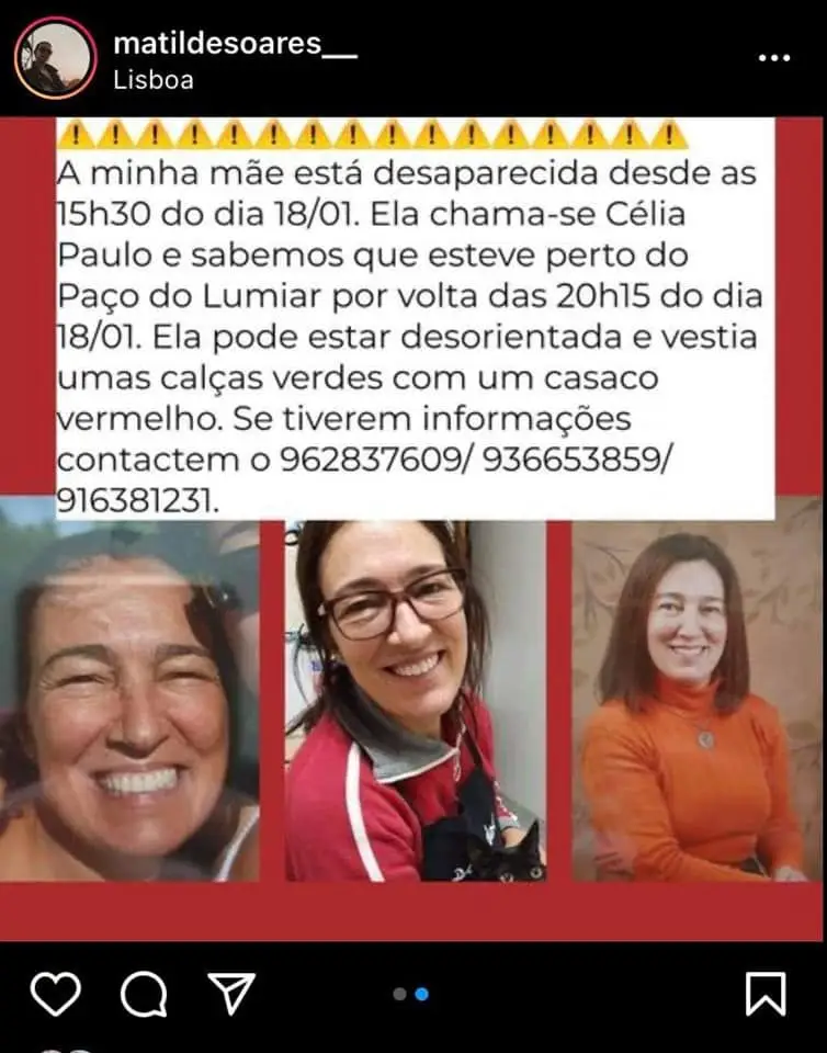 A enfermeira desapareceu na segunda-feira, depois de sair de casa às 15h30 para ir trabalhar, como era habitual. A amiga revela ainda que possivelmente Célia Paulo podia estar "desorientada".