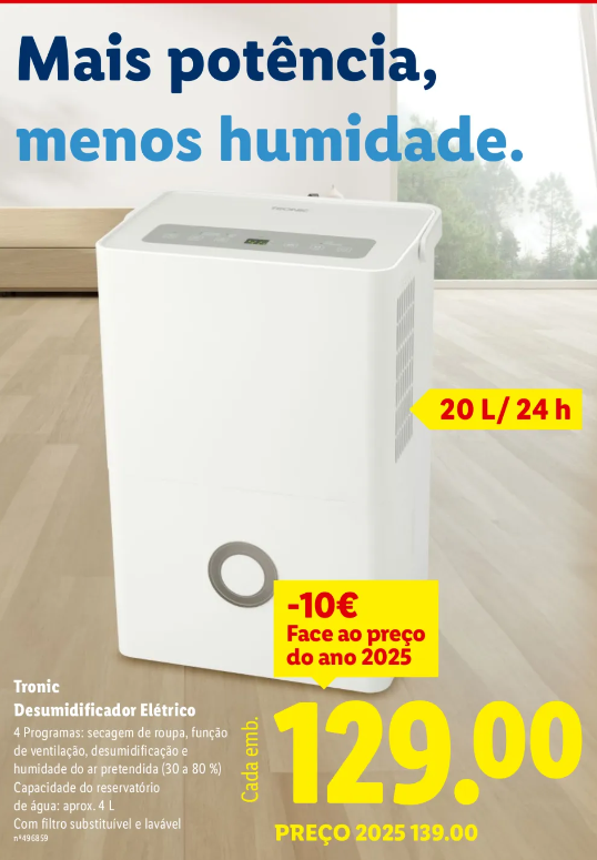 A humidade excessiva dentro de casa continua a ser um problema recorrente para muitas famílias portuguesas, sobretudo nos meses de inverno, quando o mau tempo, as chuvas persistentes e a dificuldade em secar roupa no exterior agravam as condições no interior das habitações. É neste contexto que surgem, com alguma regularidade, equipamentos pensados para ajudar a controlar estes níveis, como o Desumidificador Elétrico da marca Tronic que integra o próximo folheto do Lidl.