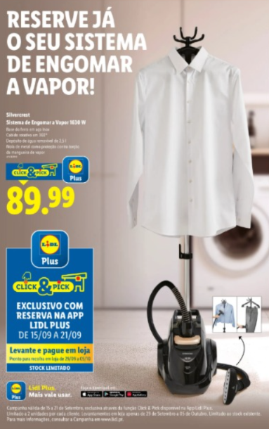 O sistema de engomar a vapor 1630 W do Lidl tem um preço definido de 89,99€. O valor aplica-se ao equipamento completo, incluindo depósito removível, suporte vertical e mangueira flexível.