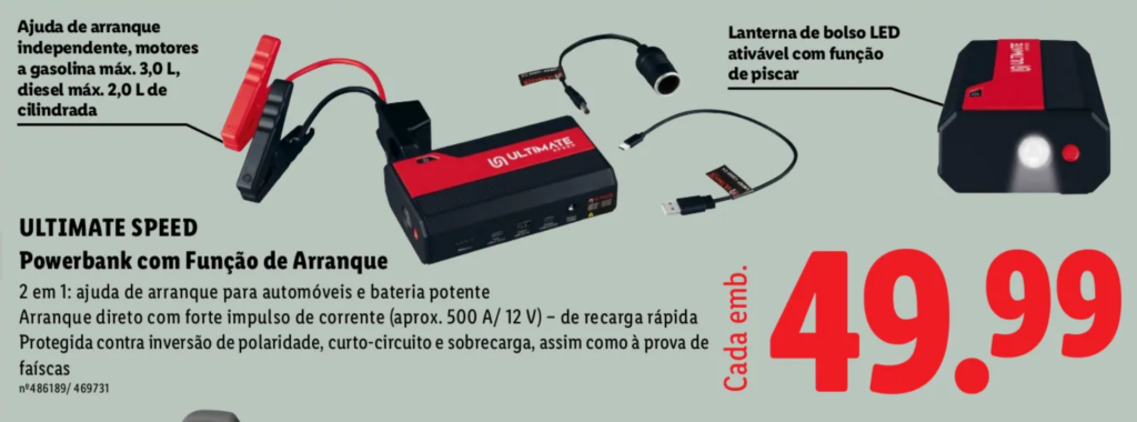 Na área dos acessórios automóveis, o Lidl voltou a incluir no seu folheto um equipamento destinado a situações de emergência na estrada. Trata-se da bateria Powerbank com Função de Arranque, um dispositivo que combina várias funções num único aparelho e que está disponível nas lojas desde o dia 6 de abril.