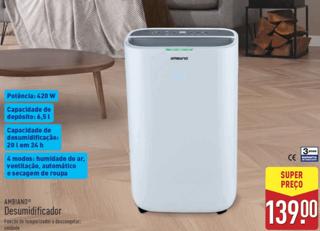 O preço anunciado para este desumidificador é de 139 euros, valor indicado como “super preço” na comunicação promocional. O equipamento estará disponível em loja a partir de terça-feira, 3 de dezembro, conforme indicado no folheto semanal.