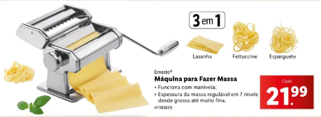 De acordo com o Lidl, trata-se de uma máquina manual de fazer massa com três funções integradas, pensada para facilitar a preparação de diferentes tipos de pasta fresca.