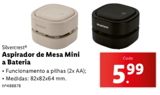 Com um preço de 5,99€, o Aspirador de Mesa Mini a Bateria do Lidl apresenta-se como uma opção económica para resolver pequenas necessidades do dia a dia. Está disponível nos espaços comerciais da cadeia Lidl, com possibilidade de escolha entre os dois modelos referidos.