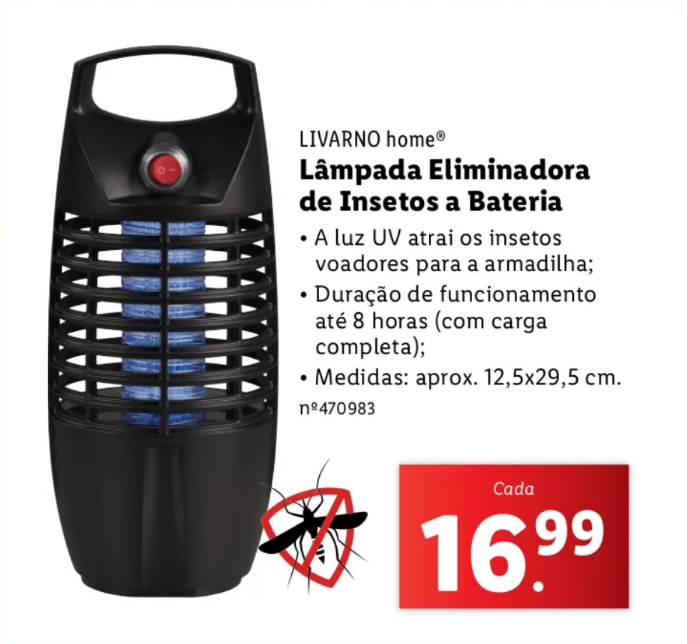 Combinando tecnologia simples, preço acessível e facilidade de utilização, esta lâmpada da Livarno Home pode ser uma opção eficaz para manter os insetos afastados. Uma opção para quem quer aproveitar o verão sem se preocupar com picadas ou voadores indesejados.