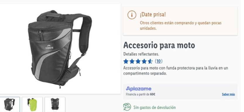 Além dos automóveis, o Lidl tem apostado em produtos dedicados a quem anda de mota. Um exemplo é a mochila desenvolvida com design ergonómico, acolchoamento nas costas e correias ajustáveis nos ombros e no peito. Com capacidade para 18 litros, inclui compartimento para protetor de costas, bolsos de rede, porta-chaves e elementos refletivos que aumentam a segurança em condições de baixa visibilidade, refere a mesma fonte.