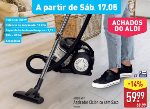 O aspirador será vendido por 59,99 euros, um valor 14% abaixo do preço de referência anterior (69,99 euros), conforme indica o folheto promocional do Aldi.