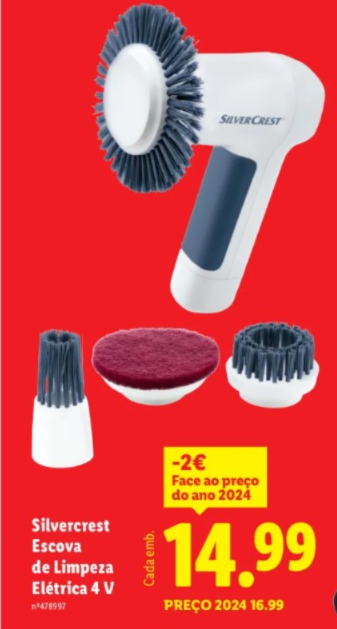 O Lidl reduziu o preço da Escova de Limpeza Elétrica 4 V para 14,99€, menos dois euros face a 2024.