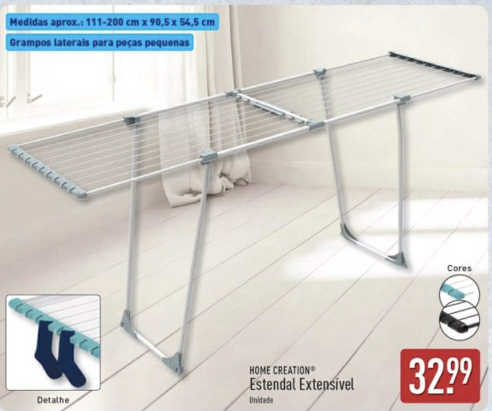 Está em destaque nos folhetos promocionais do Aldi um estendal extensível da marca Home Creation, à venda por 32,99€. O equipamento apresenta comprimento regulável entre 111 e 200 centímetros e inclui grampos laterais para acomodar peças de menor dimensão, como meias. O modelo está disponível em duas cores e é vendido à unidade.