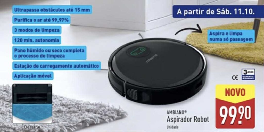 O Aldi vai colocar à venda, a partir de sábado, dia 11 de outubro, um aspirador robot Ambiano que aspira e limpa numa só passagem por 99,90€. Trata-se de uma novidade em folheto, com três anos de garantia do fabricante e um conjunto de funções pensado para quem quer automatizar as limpezas do dia a dia.