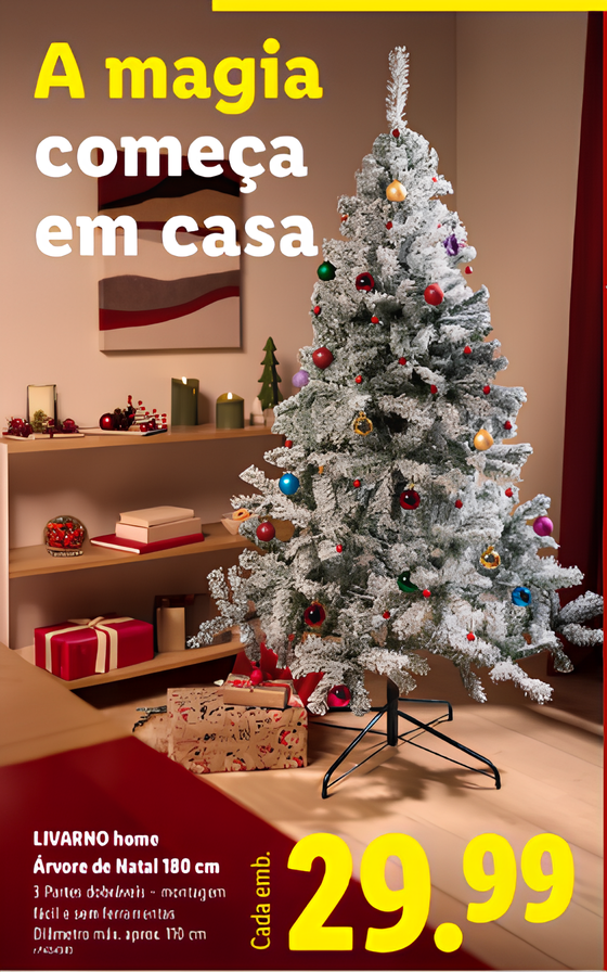 Este ano, a Árvore de Natal do Lidl pode ser uma das opções mais práticas e acessíveis para quem deseja trazer o encanto da época para dentro de casa. Trata-se de um modelo da marca Livarno Home, com 1,80 metros de altura, estrutura dobrável em três partes e montagem simples, sem necessidade de ferramentas.