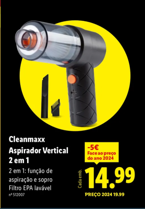 O Aspirador Vertical 2 em 1 Cleanmaxx do Lidl apresenta-se nesta campanha com uma redução face ao preço de referência do ano anterior, sendo destacado no folheto com a indicação “-5 € face ao preço do ano 2024”.
