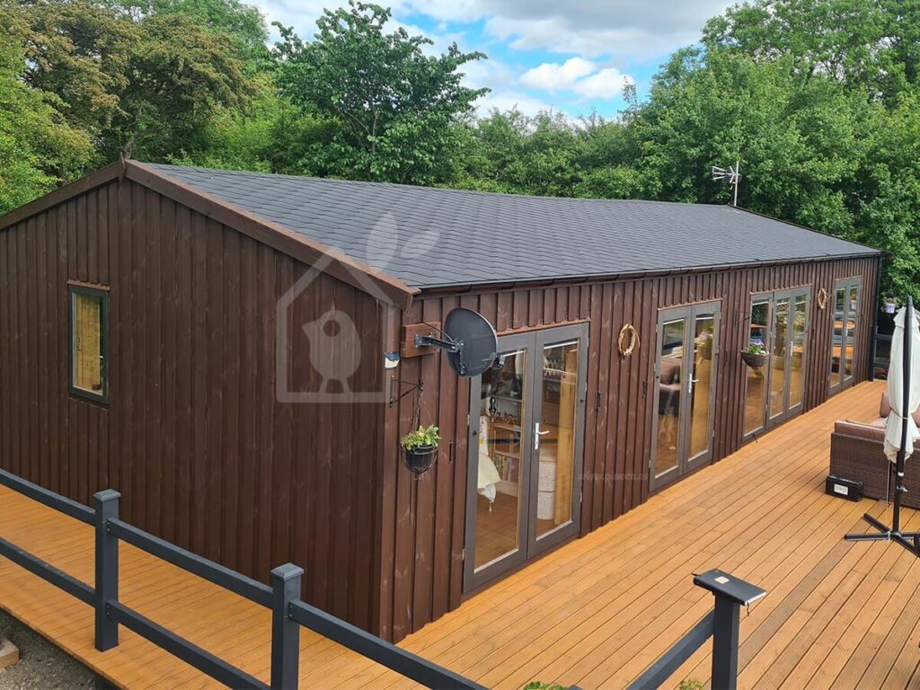 O material utilizado, pinho nórdico e abeto escandinavo certificados, garante robustez e isolamento, ao mesmo tempo que transmite a sensação acolhedora característica da madeira.