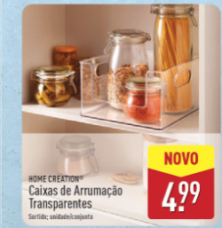 De acordo com o mais recente folheto promocional do Aldi, estas caixas são apresentadas como uma opção versátil para facilitar a organização dos produtos do dia a dia. A estrutura em plástico transparente permite ver facilmente o conteúdo sem ter de abrir ou retirar cada caixa, tornando-as particularmente úteis para armazenar alimentos secos, frascos de vidro, condimentos ou utensílios.