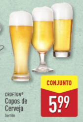 De acordo com o Aldi, os copos são da marca Crofton e surgem em formato sortido, com diferentes estilos de vidro adaptados a vários tipos de cerveja.